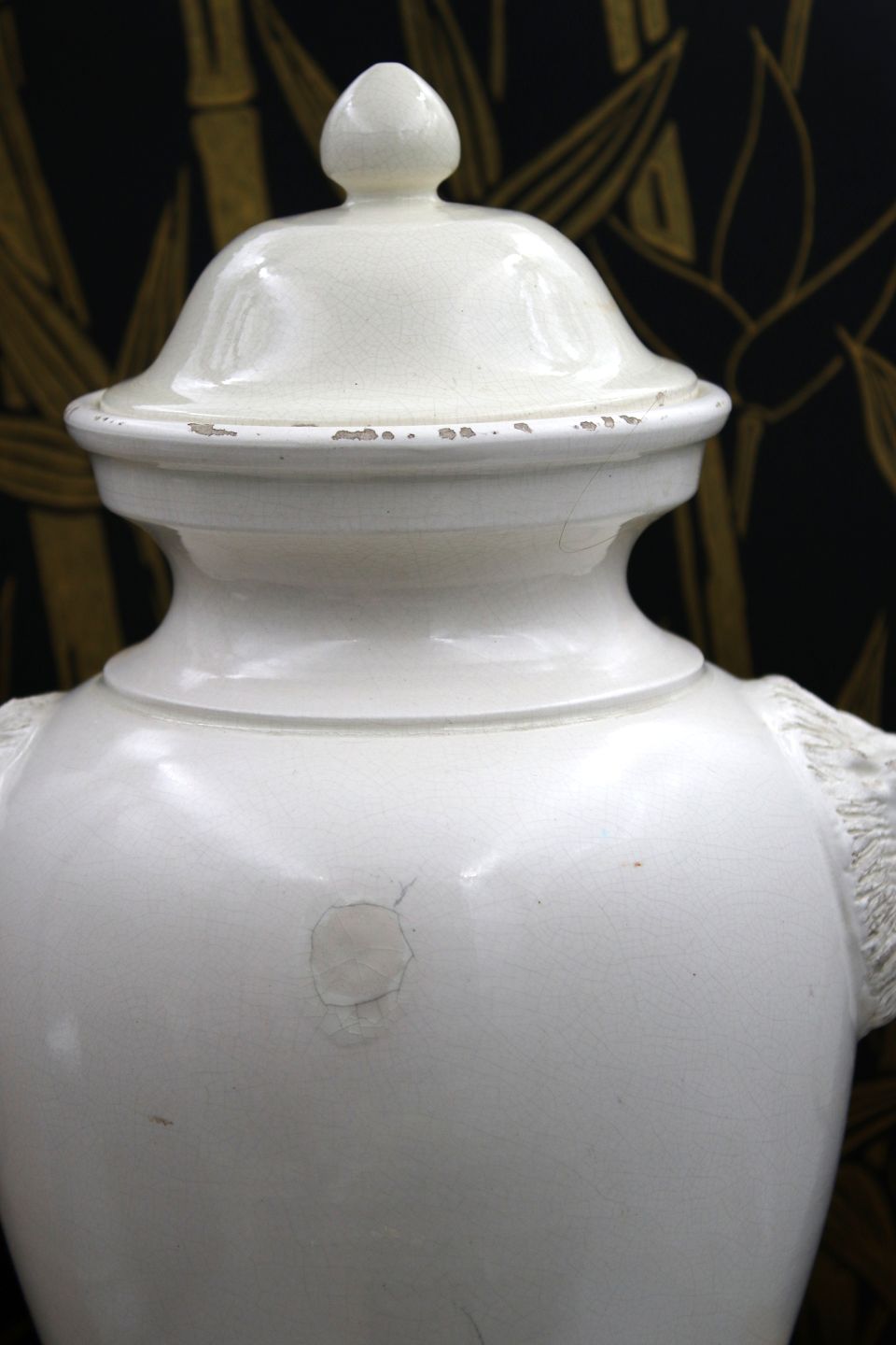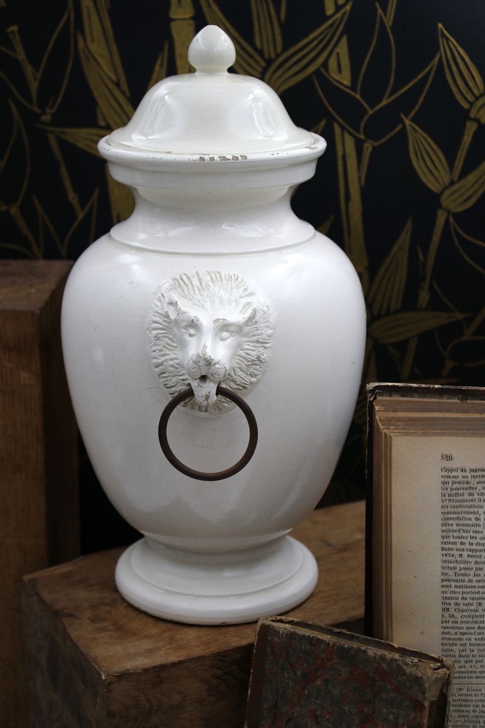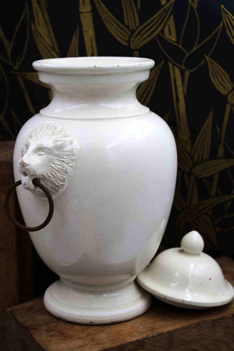 Gammel glaseret stentøjs lågkrukke med løvehoveder på siden. Krukken har en fin gammel patina og måler : H: 32cm.