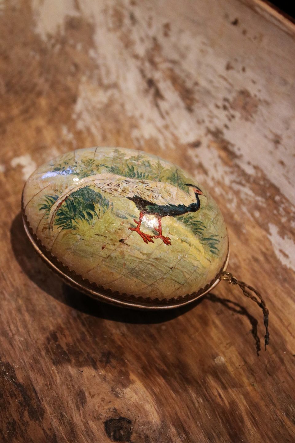 Old wooden Easter egg with painted peacocks from the early 1900s, dated inside 1904. Height: 10.5cm. Item number: Påskeæg nr.8
