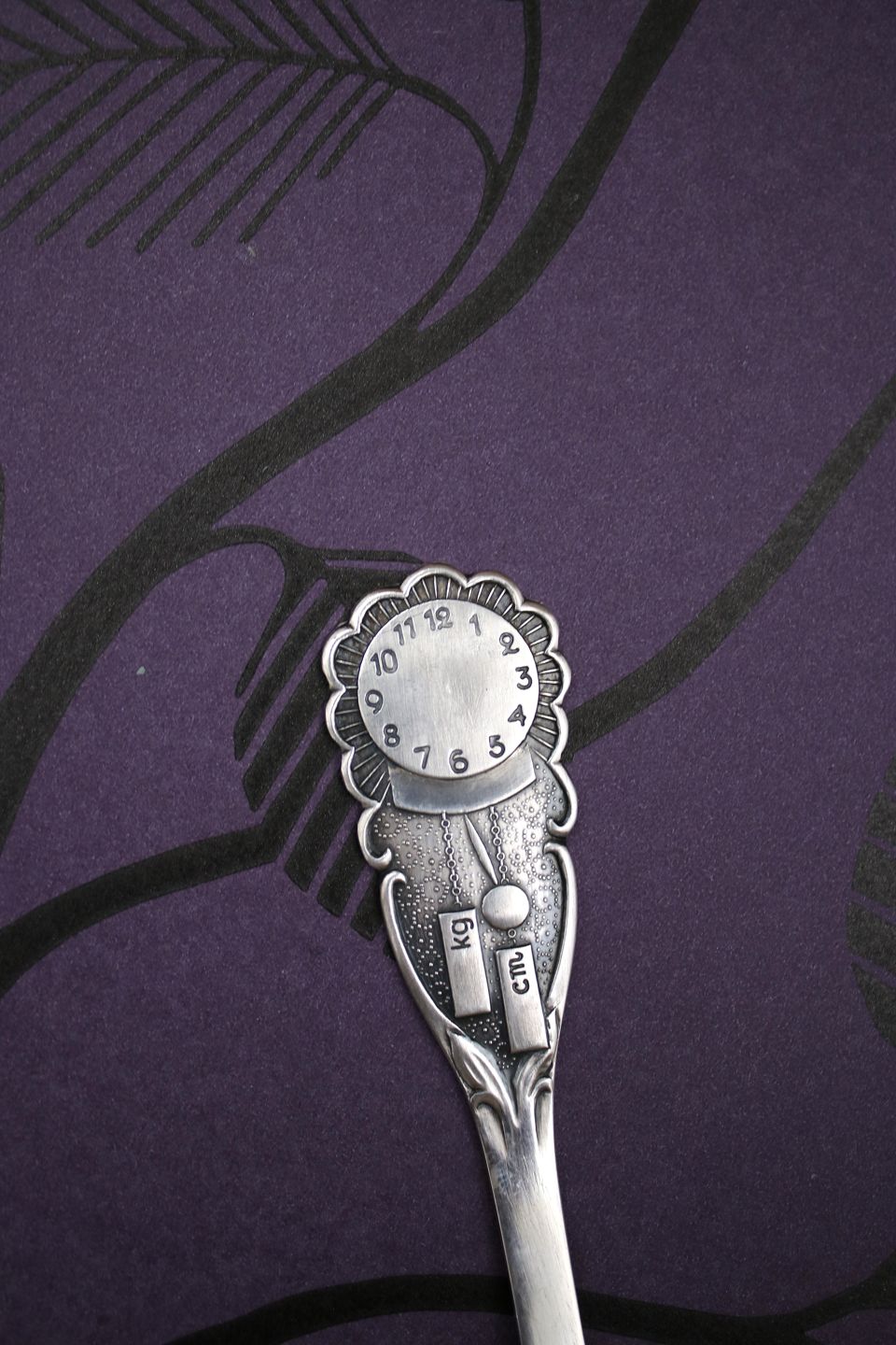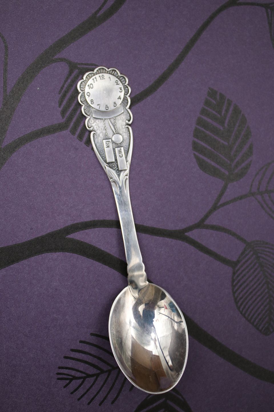 Children's spoon in silver (stamped) with a clock face motif,