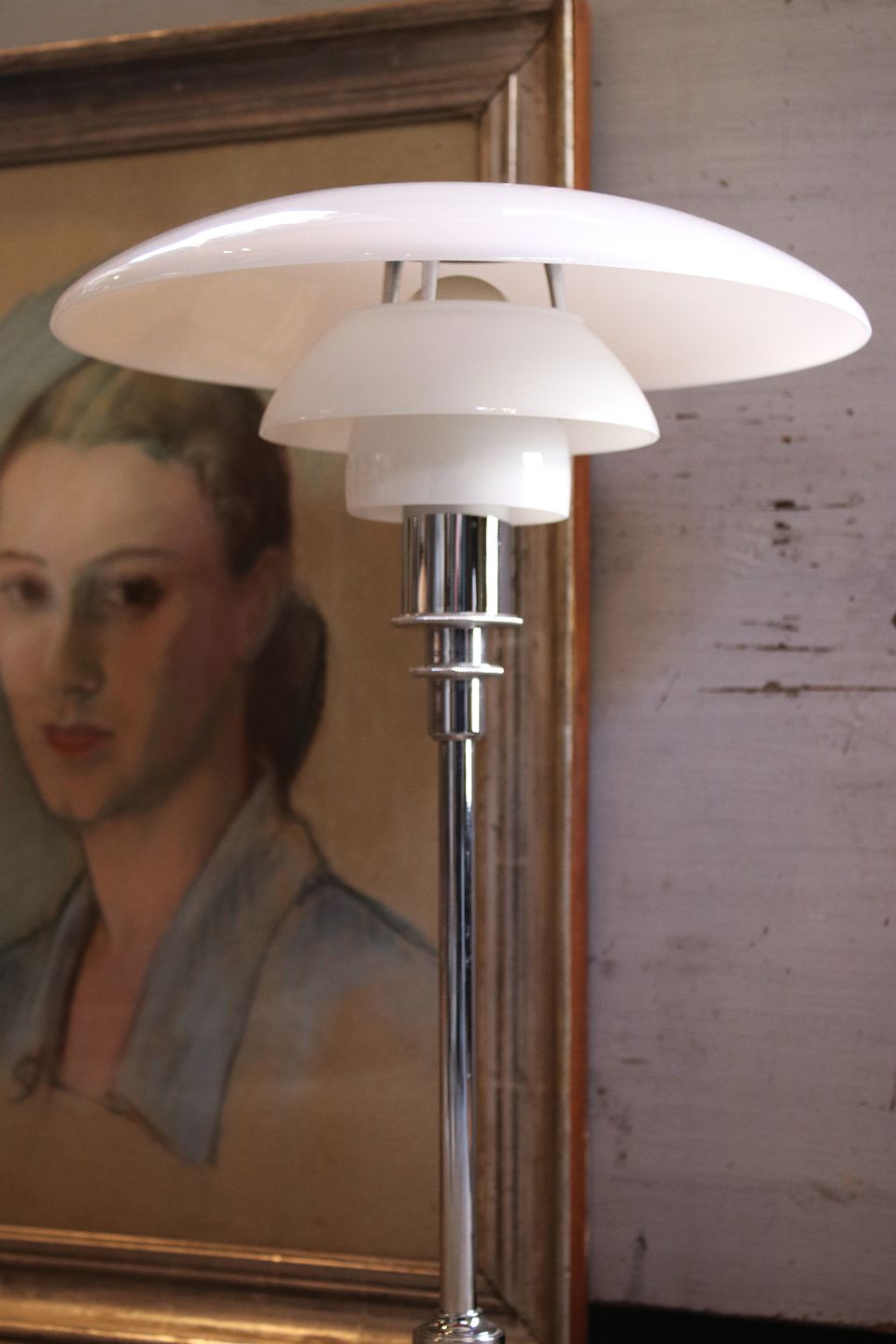 Louis Poulsen - PH 3/2 bordlampe i krom med 3 hvide glas skærme.