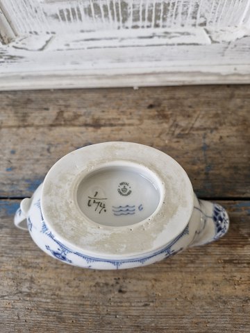 Royal Copenhagen Musselmalet halvblonde saucekande No. 674, 1. sorteirng Højde 12,5 cm. Længde 20 cm. Produceret mellem 1898-1923