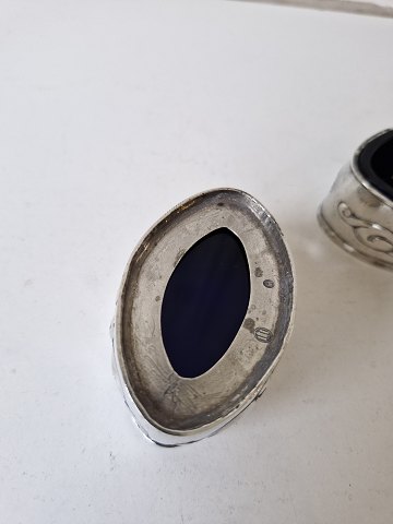 Pair of oval salt owls in silver with decoration in the art nouveau style with blue glass inserts. Stamped the three towers 1909. Dimensions 4 x 6 cm. Height 3 cm.