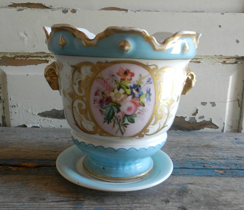 Meget smuk fransk urtepotteskjuler i turkis og guld, med håndmalede blomster dekorationer, bemærk de smukke vædderhoveder! Potten er fra midten af 1800tallet.