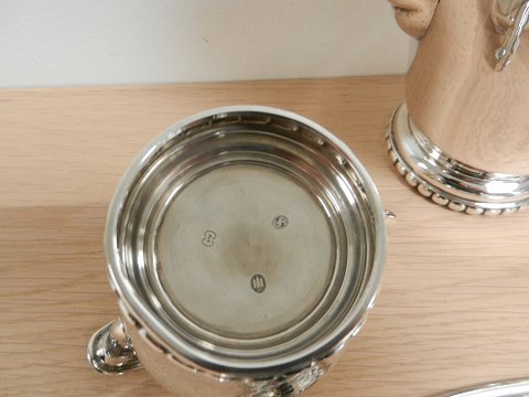 Smukt kaffeservice i hammerslået sølv bestående af kaffekande, sukkerskål, flødekande og bakke med sølv kant og bund af bakelit.