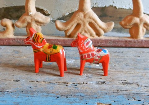 Par mini Dalar heste. Den største til venstre måler 4x5cm. Den mindste til højre måler 3,8x4,5cm.