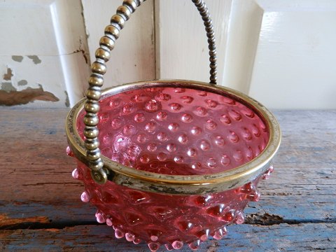 1800tals sukkerskål i hindbærfarvet glas monteret med forsølvet hank. Skålen er lavet med samme teknik som en pindsvin karaffel.