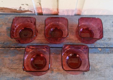 5 skønne skylleskåle i hindbærfarvet glas.