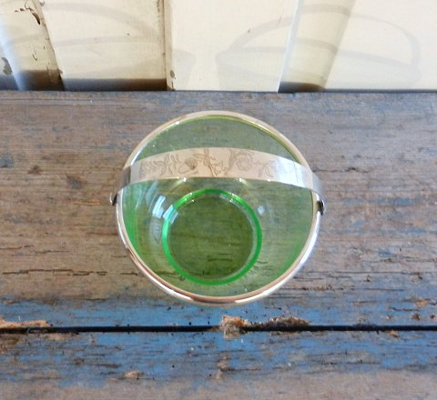 1800tals sukkerskål i æblegrønt glas med forsølvet hank.