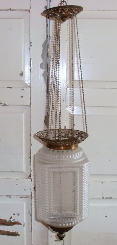 Smuk hvid ampel med ætset blomster dekoration fra Fyns glasværk 1903. Højde på selve glasset 41cm. Total højde 83cm.