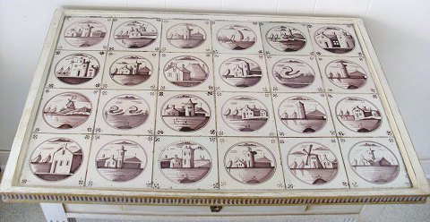 Very beautiful 19th century grey-painted Gustavian tile table with 24 manganese-coloured Dutch tiles. Measures 56x84cm. Height 77 cm.