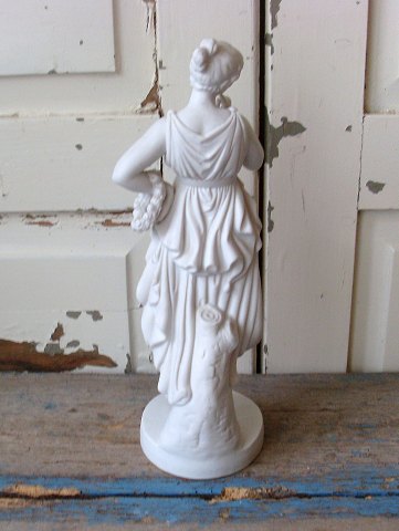 Smuk bisquit figur i form af klassisk kvinde med blomster krans. Fremstår med gammel reparation på blomster kransen, se billed. Højde 32cm.
