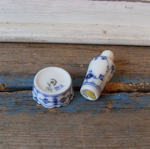 Royal Copenhagen Musselmalet riflet kuvert salt og peber No. 199-439, 1. sort. Saltkar no. 199, diameter 4,5cm. solgt Peberbøsse no. 439, højde 6cm. solgt