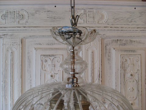 Smuk stor sækkeformet prisme ampel til tre lyskilder. Bemærk de smukke aflange prismer. Højde 45cm. Diameter 30cm.