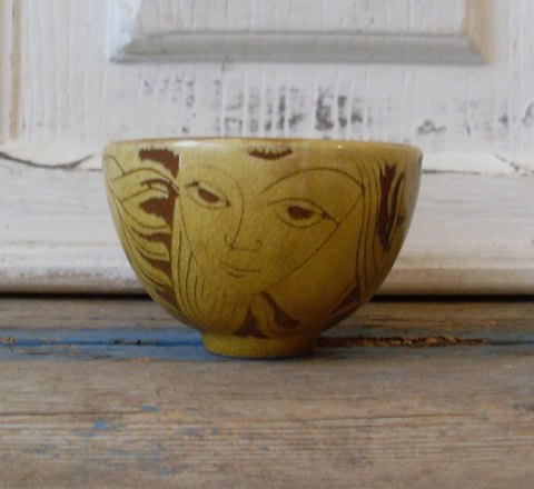 Niels Thorsson for Royal Copenhagen unika skål dekoreret med fire forskellige kvinde ansigter i skøn gul og grøn glasur.
