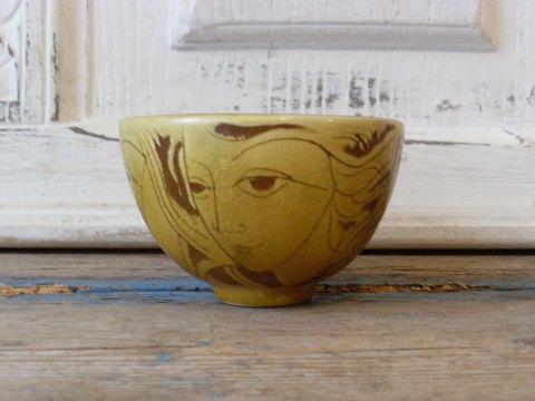 Niels Thorsson for Royal Copenhagen unika skål dekoreret med fire forskellige kvinde ansigter i skøn gul og grøn glasur.