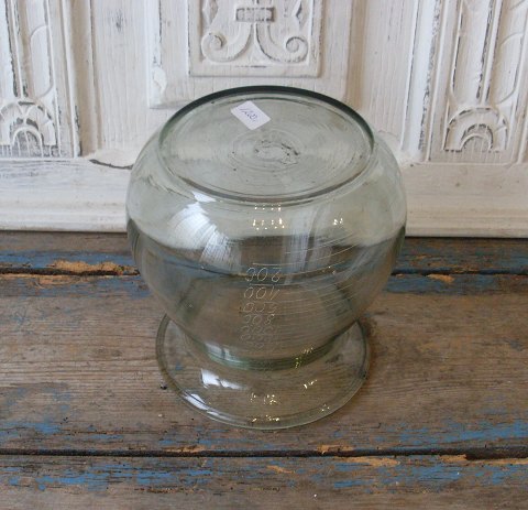 Gammelt mundblæst apoteker glas, påmalet måleenheder.