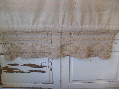 Gammelt vintage rullegardin med hæklet kant.