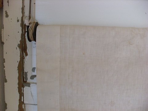 Gammelt vintage rullegardin med hæklet kant.
