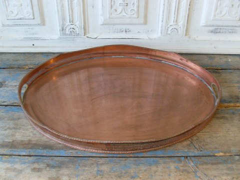 Stor galleribakke i kobber. Har tidligere været forsølvet, men fremstår nu helt afpudset. Fremstår med skøn patina. Mål 41x60cm.