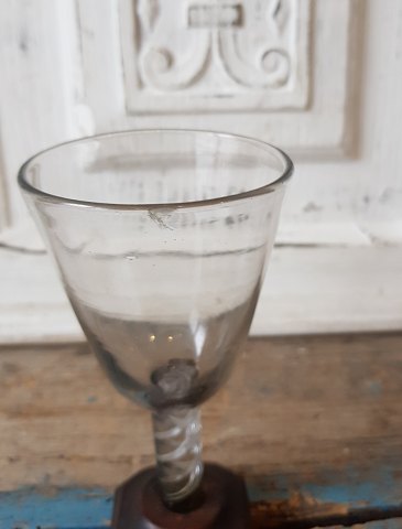 Norsk 1700tals glas med luft spiral i stilken på træfod. Fremstår med en fejl på glassets rand, se billed - det er ikke et skår. Højde 14,5 cm.