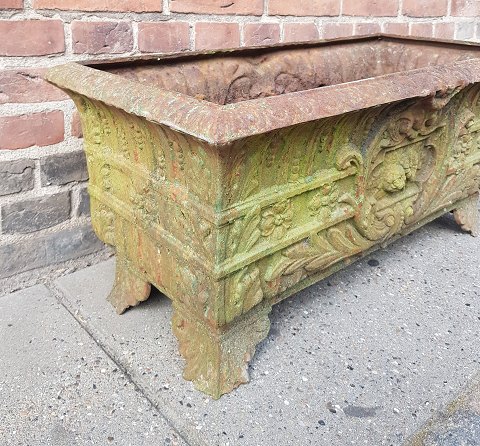 Meget stor fransk havekumme i støbejern fremstår i fantastisk grøn farve. Der er dræn huller i bunden. Højde 36 cm. Mål 38 x 78 cm.