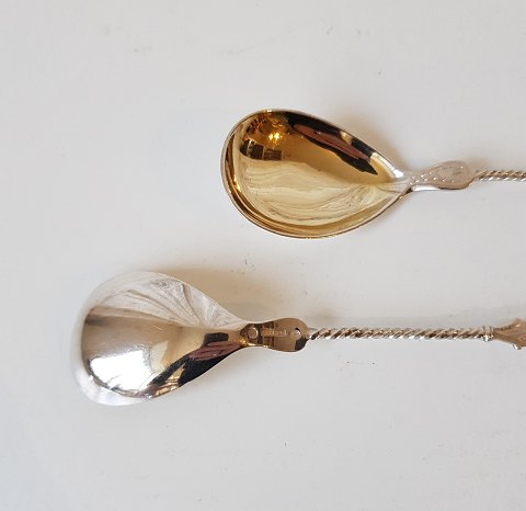 Par marmeladeskeer i sølv fra 1879 Nygotisk stil. Stemplet: P.Hertz - de tre tårne 1879. Længde 14,9 cm.