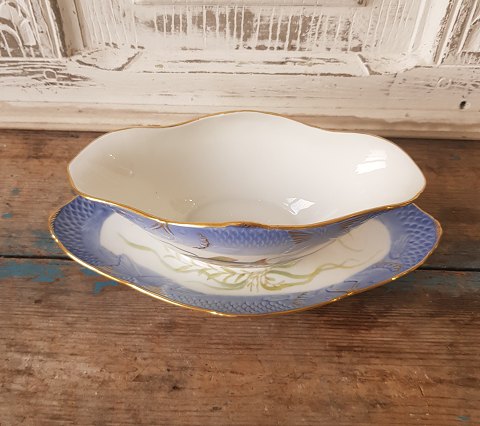Royal Copenhagen Fiskestel med guld saucekande dekoreret med fisk og tang.
