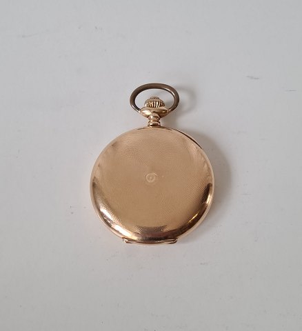 Dobbeltkapslet lommeur af 14 kt. guld, cremefarvet emaljeret urskive med romertal, time- og minutviser, samt sekundviser.