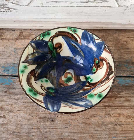 Kähler kohorns dekoreret skål i blå, grønne og brune farver. Fremstår med et par glasur afslag langs kanten. Højde 6 cm. Diameter 16,5 cm.