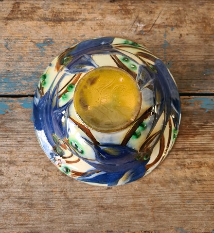 Kähler kohorns dekoreret skål i blå, grønne og brune farver. Fremstår med et par glasur afslag langs kanten. Højde 6 cm. Diameter 16,5 cm.