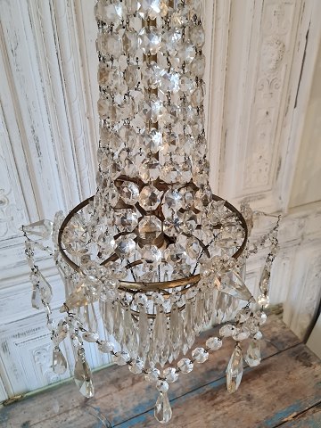 Stor smuk gammel prismelysekrone med tre lyskilder. Fremstår i flot stand. Højde 85 cm. Diameter 26/37 cm.