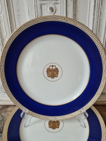 Sæt på 6 B&G dækketallerken dekoreret med kongeblå fane, græsk evighedsmønster og våbenskjold i guld.