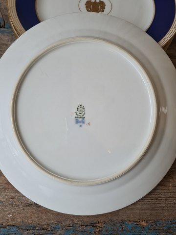 Set på 6 B&G dækketallerken dekoreret med kongeblå fane, græsk evighedsmønster og våbenskjold i guld 26 cm.
