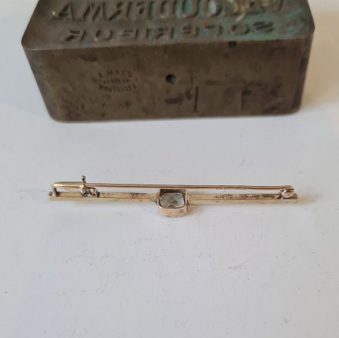 Brooch in 14 kt gold with square clear stone. Stamp: 585 Length: 6 cm. Dimensions of the stone: 7 x 7 mm.