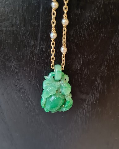 Necklace in 18 kt gold with beautifully carved jade and Akoya pearls. Appears without stamps - is acid tested to a value of 18 kt.