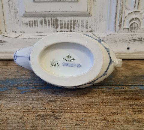 Royal Copenhagen Blue Fluted sauce bowl No. 407, Factory first Height 14 cm. Length 21 cm. Appears with a microscopic notch at the base - see picture. Produced between 1894-1900