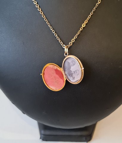 1800tals medaljon med 6 ægte perler i lang kæde i 14 kt.
