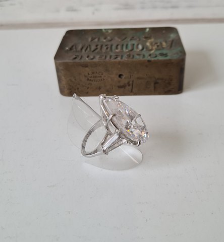 Cocktail ring i sterlingsølv med stor pear slebet klar sten flankeret af to mindre baguette slebne klare sten.
