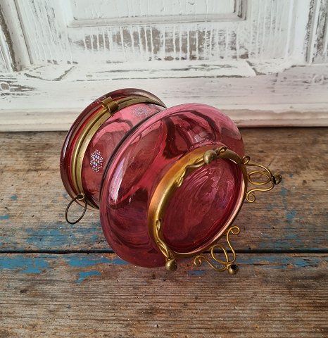 1800 tals smykkeskrin i hindbær/lyserødt glas med emaljebemaling
