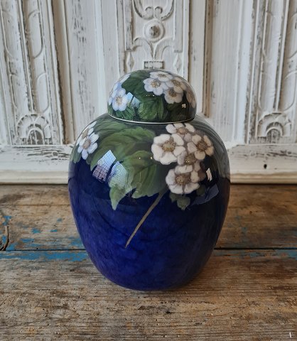 Royal Copenhagen Art Nouveau vase decorated with strawberry flowers, strawberry leaves on a blue background Painted by Else Hasselriis no. 2361/1242