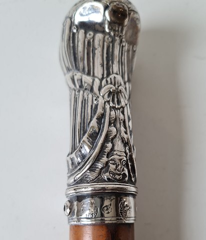 The silver knob is very beautifully made in Rococo style, note the little face / mascaron. The stick itself is made in Malaccatree.
