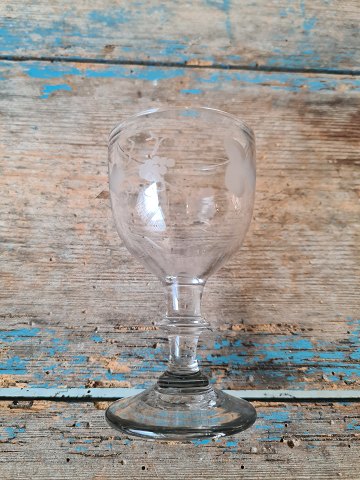 Vinglas med rund kumme på stilk med knap, dekoreret med matslebet vinløv med tre drueklaser.