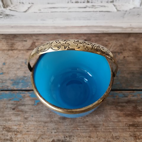 1800tals sukkerskål i lyseblå opalineglas med messing hank.