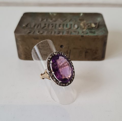 Antik 14 kt guldring - stor smuk ametyst omkranset af talrige diamanter