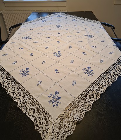 Broderet dug med Blå Blomst mønster 137 x 137 cm.