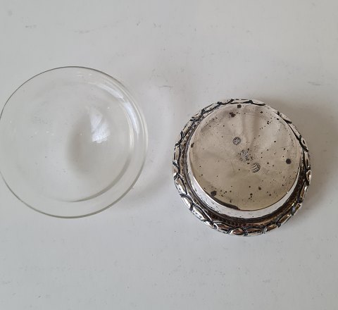 Smukt saltkar i hammerslået sølv med glas indsats Stemplet de tre tårne 1920 Højde 3 cm. Diameter 6 cm.