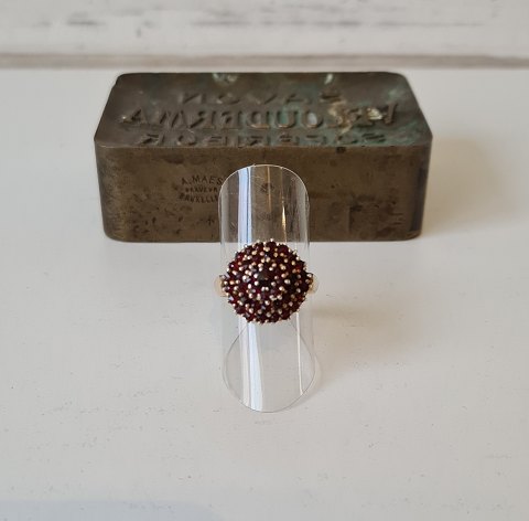 Vintage rosette ring in 14 kt gold with numerous garnets Stamped: V.Lind - 585 Ring size 53 - Diameter of the rosette 15 mm. With engraving