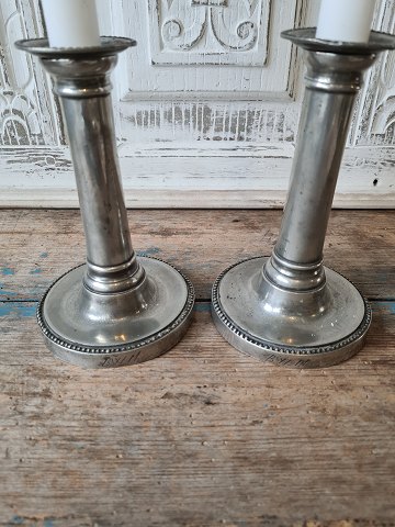Par smukke 1800tals tin lysestager med perlekant - løse manchetter. Fremstår med ejerinitialer: BWM Højde 17 cm.
