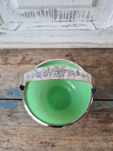 1800s sugar bowl in green opaline glass with silver-plated mounting Height 7.5 cm. Diameter 12 cm.