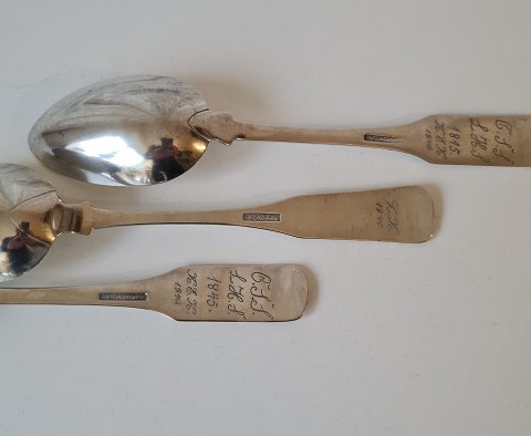 Sæt på 3 spiseskeer i sølv med musling mønster - Niels Nielsen 1808-73 Kolding Stemplet: N.Nielsen Længde 22 cm.